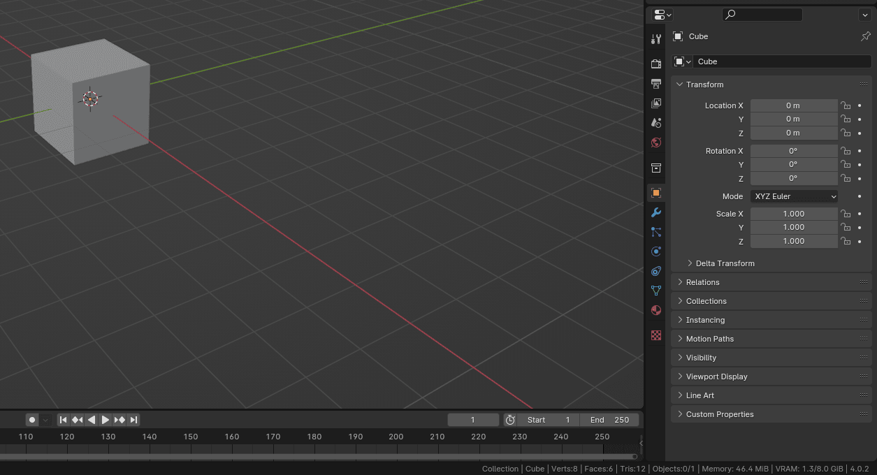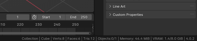 首先你会看到所选集合的名称 - Collection,所选物体的名称 - Cube,该物体的顶点数 - 8,面数 - 6,以及集合中的物体数量。之后还有内存和显存等其他重要信息,但等到我们开始建模和渲染时再细说。