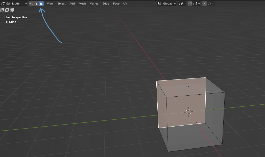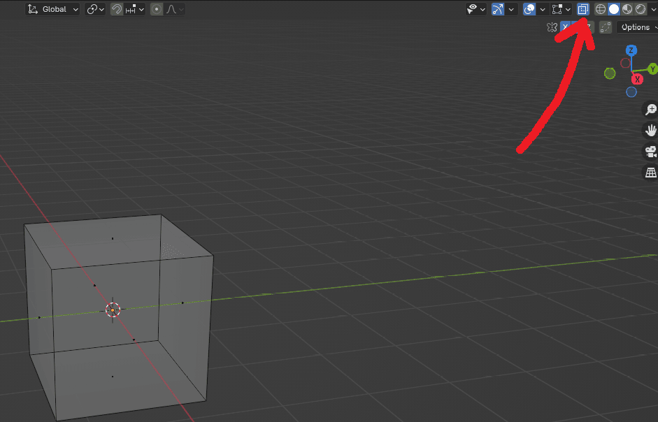 你可能注意到我展示立方体时能看到它内部(透明的)。这叫 X射线模式。你可以点击箭头指向的位置激活它,或者直接按"ALT+Z"。关闭的方法也一样,点击屏幕或键盘都可以。