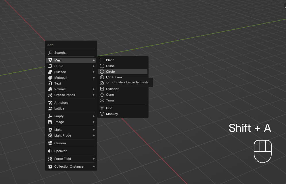 现在按"SHIFT+A",去 Add mesh → Circle