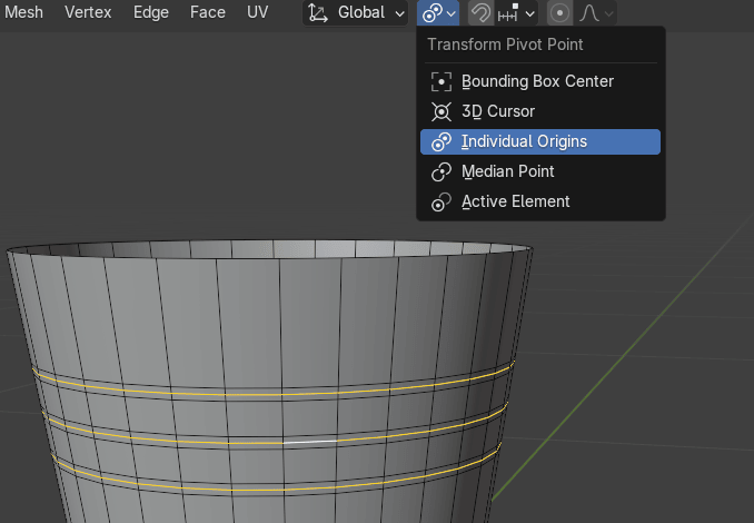 把Median Point(中点)切换到individual origins(各自原点),这样在缩放时环线就不会沿着Z轴互相移开。