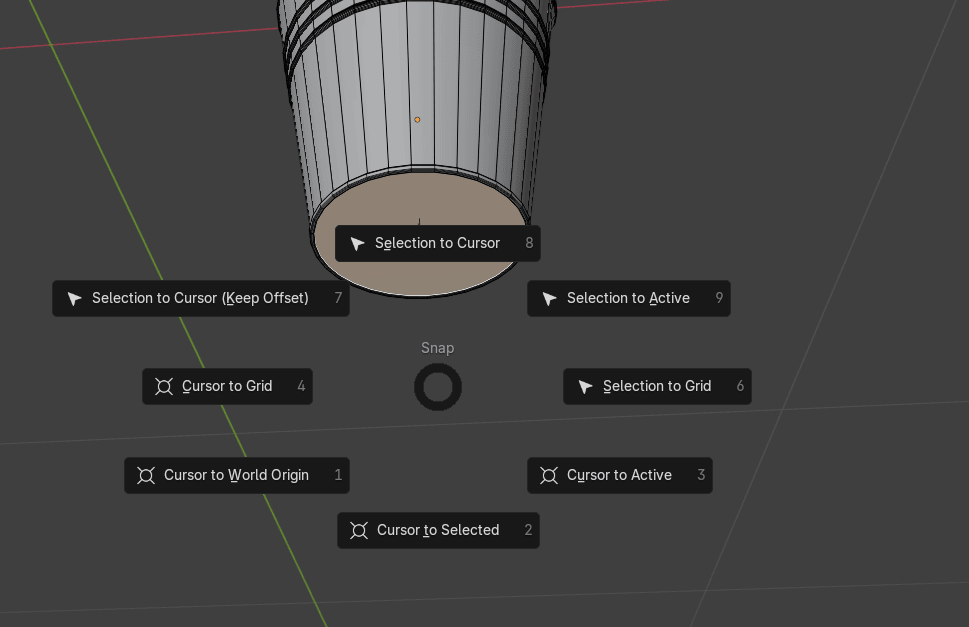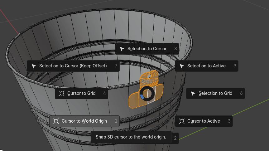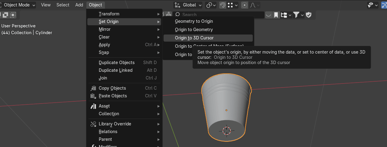 切换到物体模式,选择 object → Set origin → Origin to 3D cursor(原点到3D游标)。