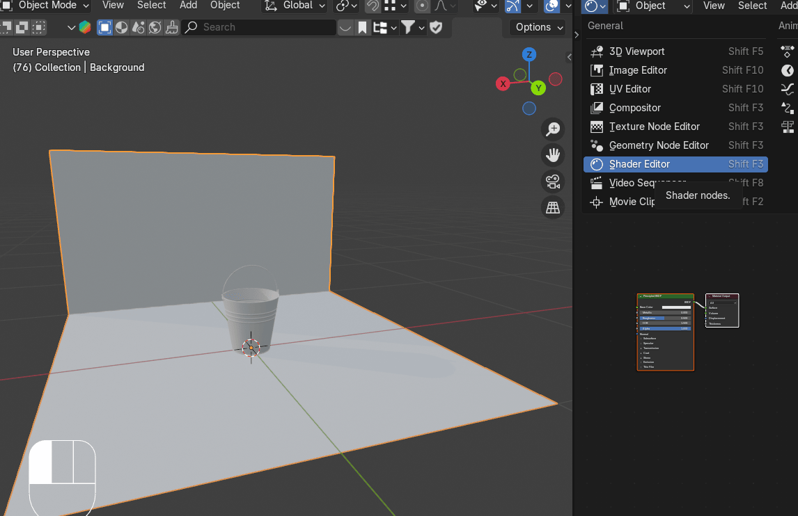 在你刚创建的窗口打开shader editor(着色器编辑器)。按"N"隐藏右侧边栏,因为你不需要它。