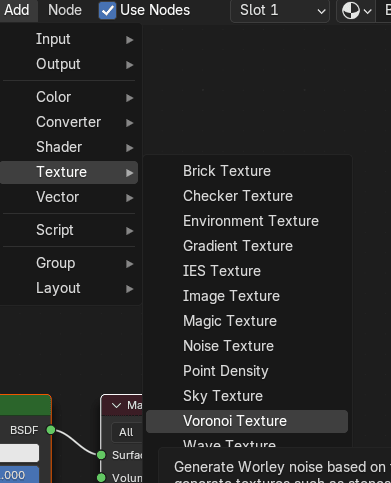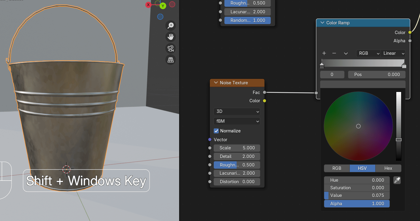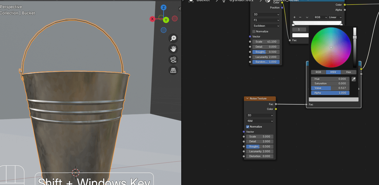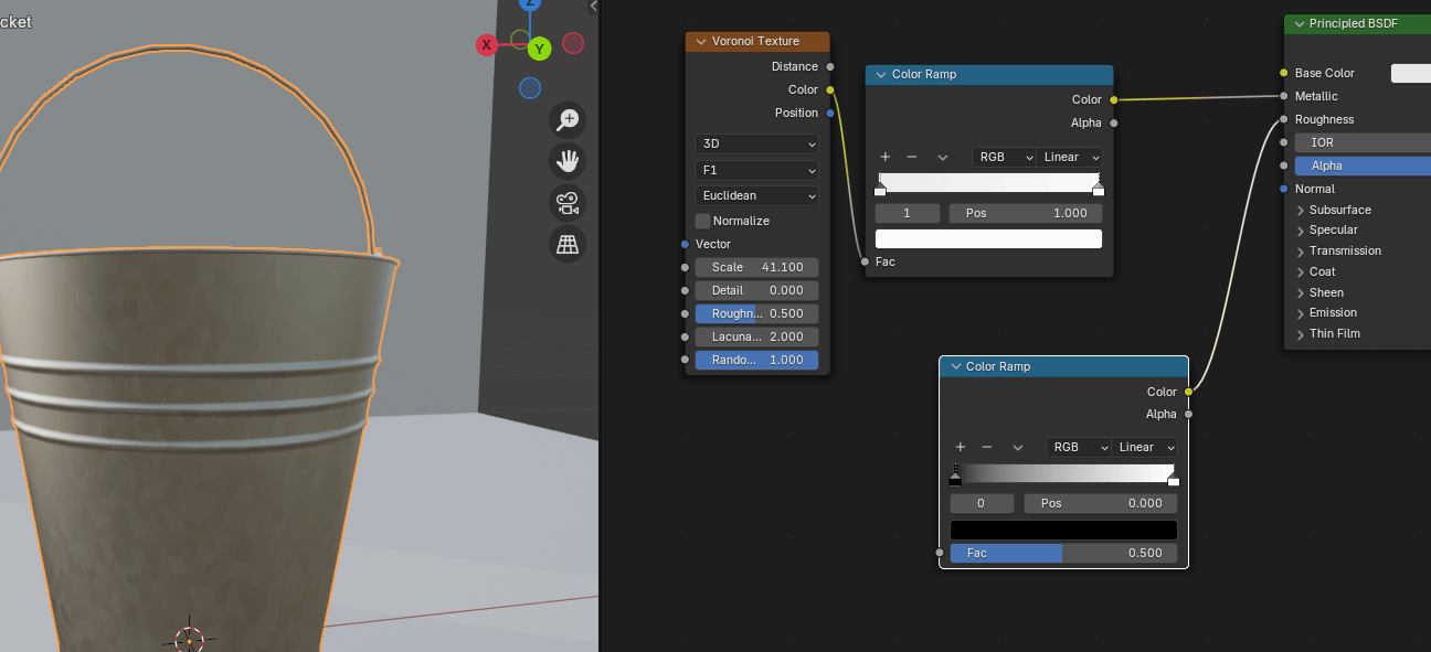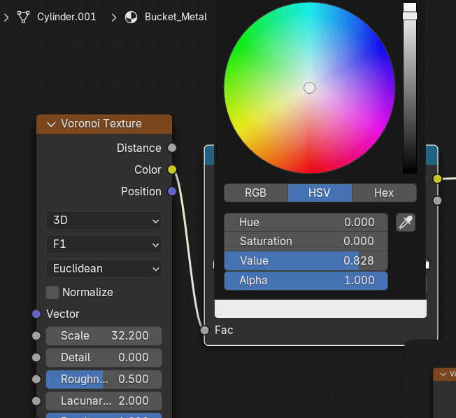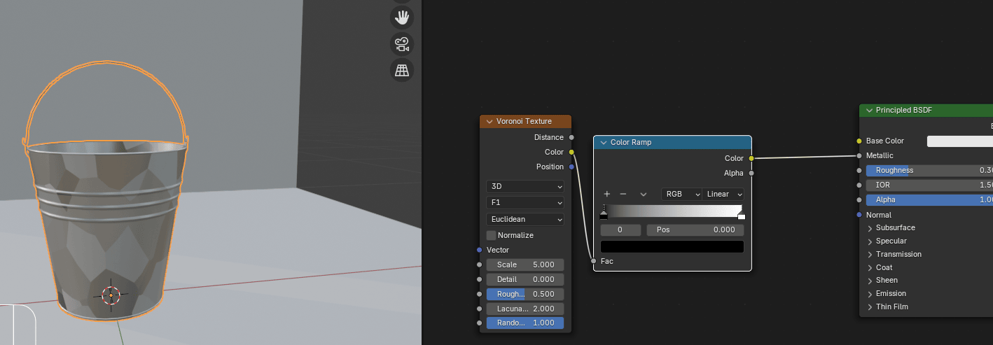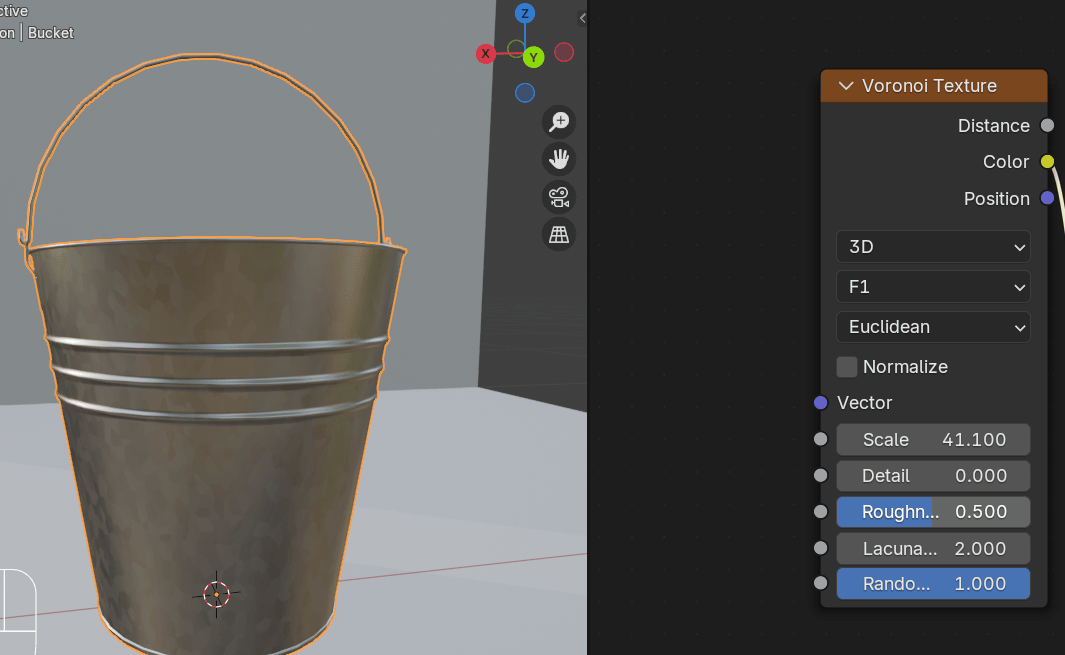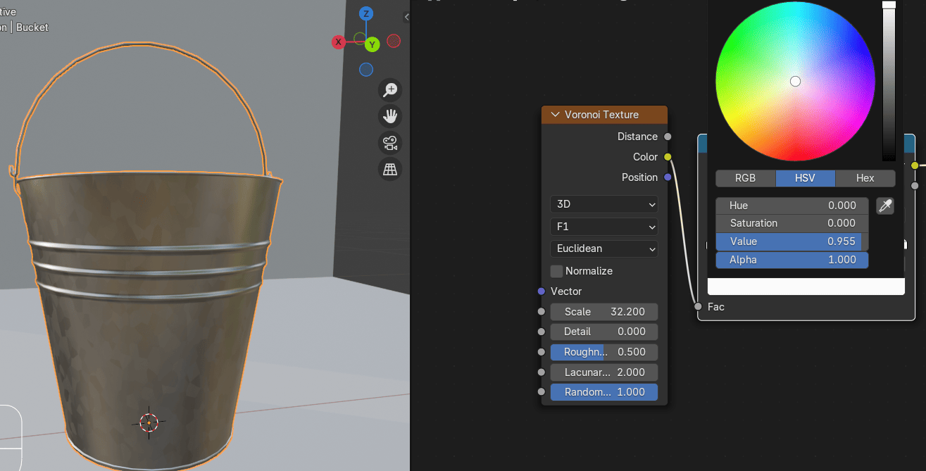 添加 - texture - Voronoi texture,在水桶上添加不同颜色的斑点。