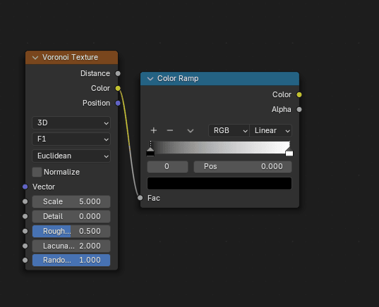 把Voronoi Texture的Color连接到Color Ramp的Fac,这样可以获得灰度颜色渐变。