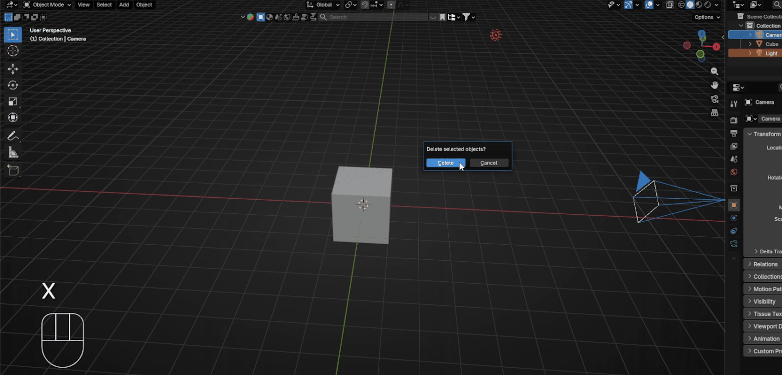 首先,选中摄像机和灯光,然后用 "X" 删除它们。